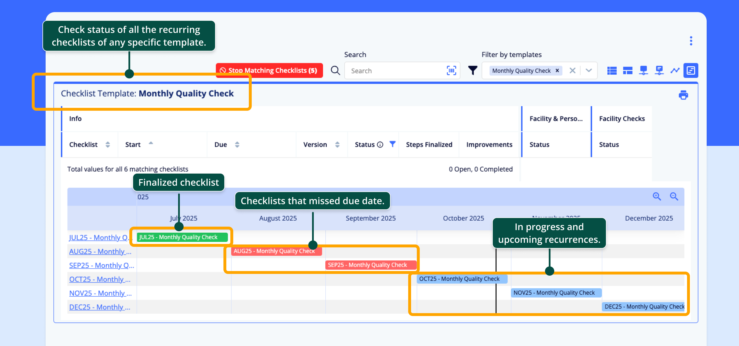 - Visual timeline: See future and completed checklists graphically