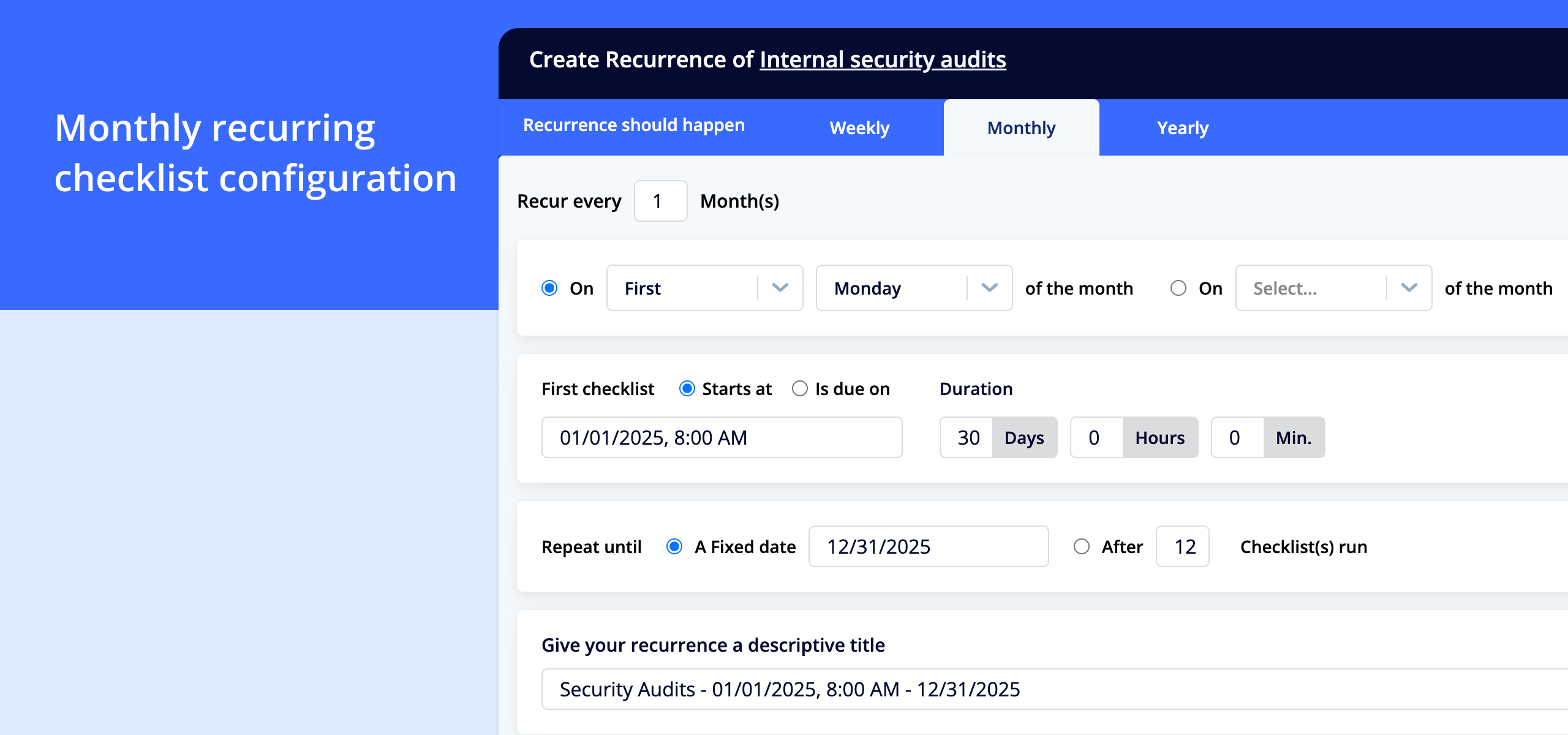 Recurring checklists define exactly “when” and ensure it actually happens.