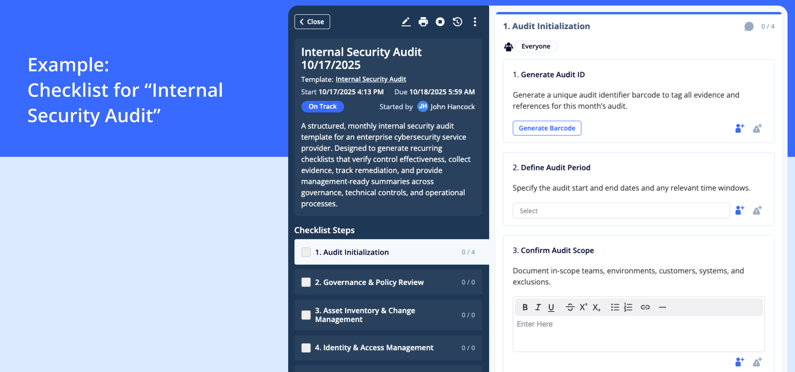System creates new checklists automatically **Real-world example:**An IT consulting firm in Northern Europe uses monthly checklists for internal security audits. The first Monday of each month, a new checklist is created that the IT manager must complete. The history shows they’ve conducted 24 consecutive audits without missing a single one – something their ISO 27001 auditor noted very positively.